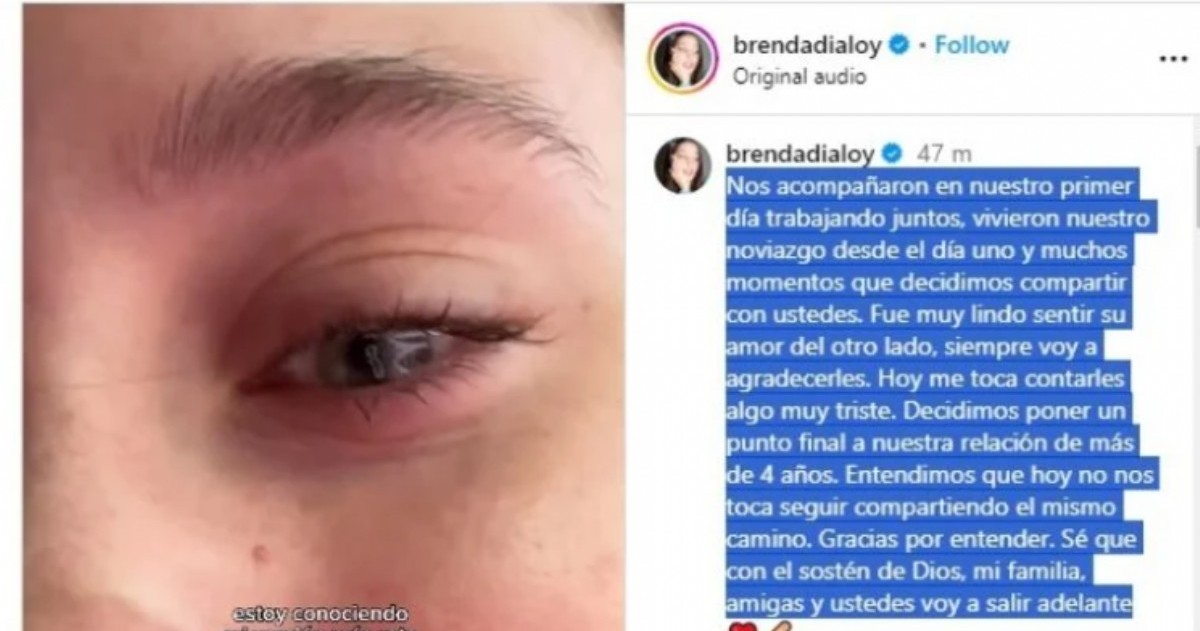 “Nos acompañaron en nuestro primer día trabajando juntos, vivieron nuestro noviazgo desde el día uno y muchos momentos que decidimos compartir con ustedes. Fue muy lindo sentir su amor del otro lado, siempre voy a agradecerles. Hoy me toca contarles algo muy triste. Decidimos poner un punto final a nuestra relación de más de 4 años. Entendimos que hoy no nos toca seguir compartiendo el mismo camino. Gracias por entender. Sé que con el sostén de Dios, mi familia, amigas y ustedes voy a salir adelante”, manifestó la joven comunicadora en la red social junto a un corto clip donde se la vio movilizada hasta las lágrimas.