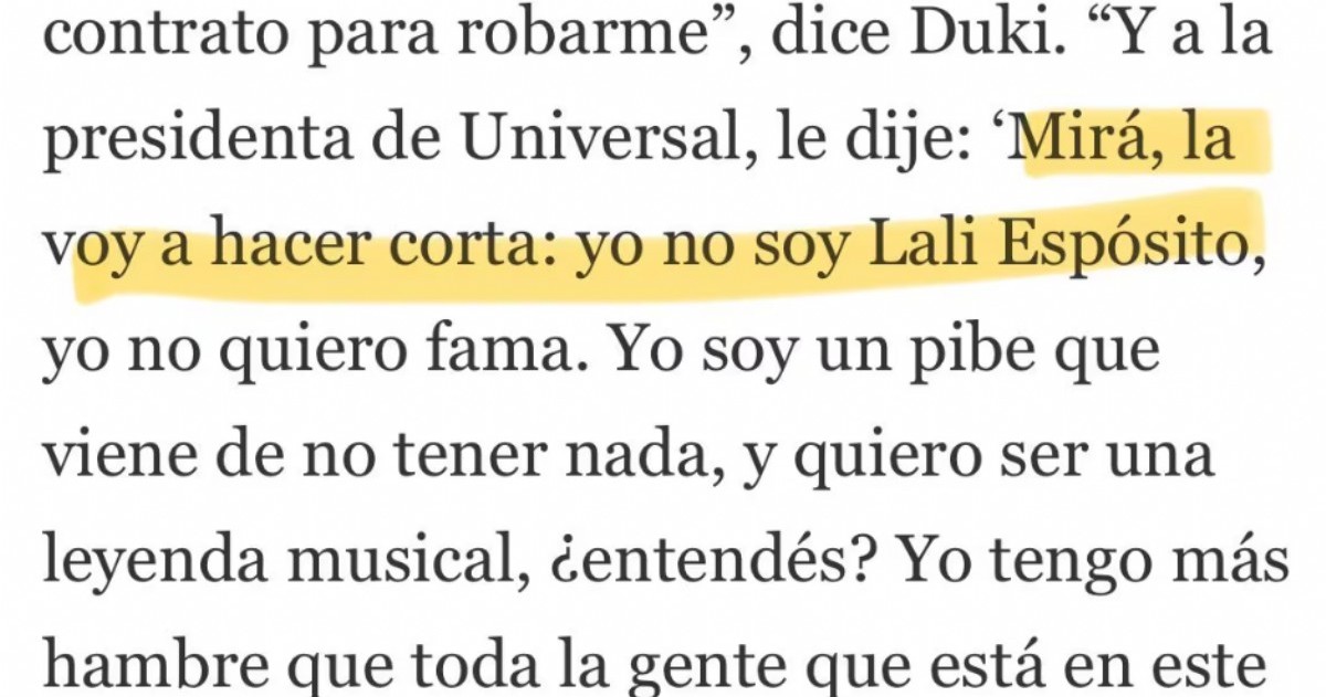 A lo que Lali Espósito salió a responderle sin filtro: “Avísenle a Duki que yo también nací con MUCHA hambre por eso llegué a donde llegué. Tampoco busqué fama. Vino! Y yo también le digo al presidente de Sony Music a dónde quiero llegar. Saludos”.