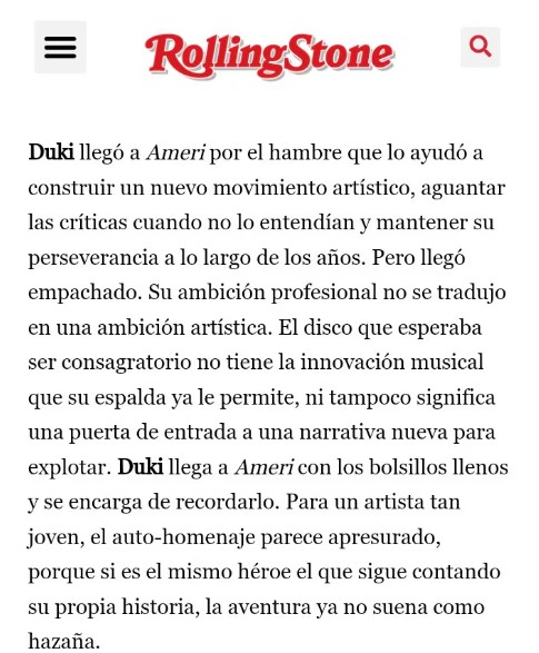 “Duki llegó a Ameri por el hambre que lo ayudó a construir un nuevo movimiento artístico, aguantar las críticas cuando no lo entendían y mantener su perseverancia a lo largo de los años. Pero llegó empachado. Su ambición profesional no se tradujo en una ambición artística. El disco que esperaba ser consagratorio no tiene la innovación musical que su espalda ya le permite, ni tampoco significa una puerta de entrada a una narrativa nueva para explotar. Duki llega a Ameri con los bolsillos llenos y se encarga de recordarlo. Para un artista tan joven, el auto-homenaje parece apresurado, porque si es el mismo héroe el que sigue contando su propia historia, la aventura ya no suena como hazaña”, dice la parte de la reseña de la Rolling Stone que generó una ola de comentarios en las redes sociales.