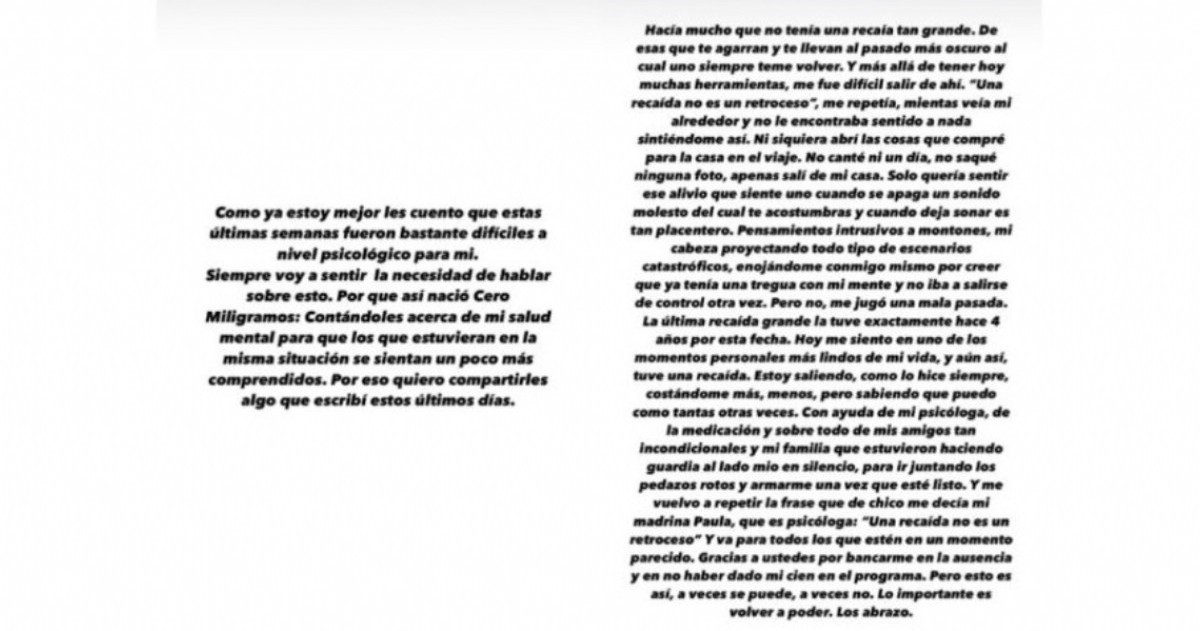 "Hacía mucho que no tenía una recaída tan grande, de esas que te agarran y te llevan al pasado más oscuro al cual uno siempre teme volver. Y más allá de tener muchas herramientas, me fue difícil salir de ahí", reveló.