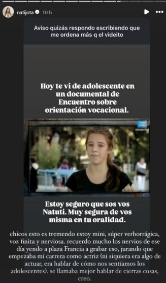 “Hoy te vi de adolescente en un documental de Encuentro sobre orientación vocacional. Estoy seguro de que sos vos, Nati. Muy segura de vos misma en tu oralidad”, le dijeron.