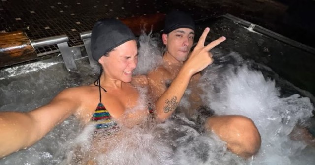 Una de las fotos más comentadas mostró a la pareja en un hidromasaje, sonriendo a cámara, y otra los muestra compartiendo confites de colores. La complicidad también se coló en una selfie frente a un gran espejo de madera, con Trueno al fondo de la habitación.