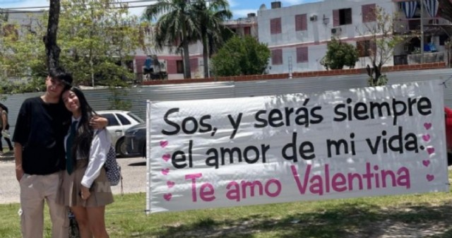 El inicio de la jornada en la Escuela de Comercio E.P.E.S. número 51 tuvo un condimento especial. Mauricio, alumno de 6° II, decidió sorprender a su novia Valentina con un pasacalles colocado en la entrada del establecimiento, una escena poco habitual que rápidamente se volvió el tema del día entre estudiantes, docentes y preceptores.