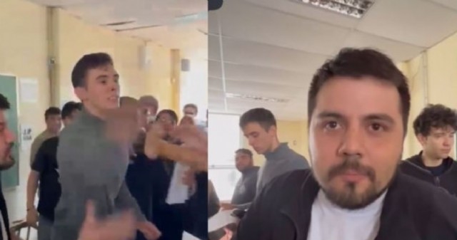 Según se observa en los registros del momento, los manifestantes ingresaron al aula con cantos y carteles, y comenzaron a corear consignas contra los expositores. En medio de la interrupción, se escucharon frases como “Fuera, fachos, fuera”, mientras avanzaban sobre el espacio donde se desarrollaba la actividad.